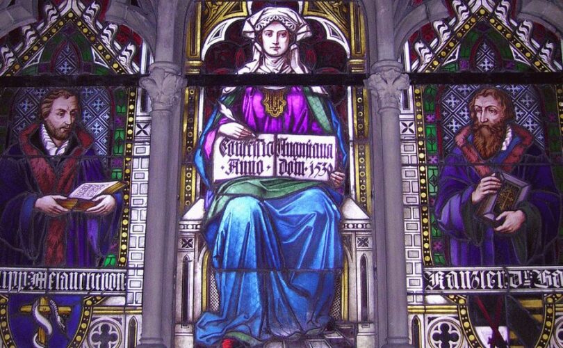 Foto: vitraliu care reprezintă Biserica (femeia) care are în mână confesia de la Augsburg